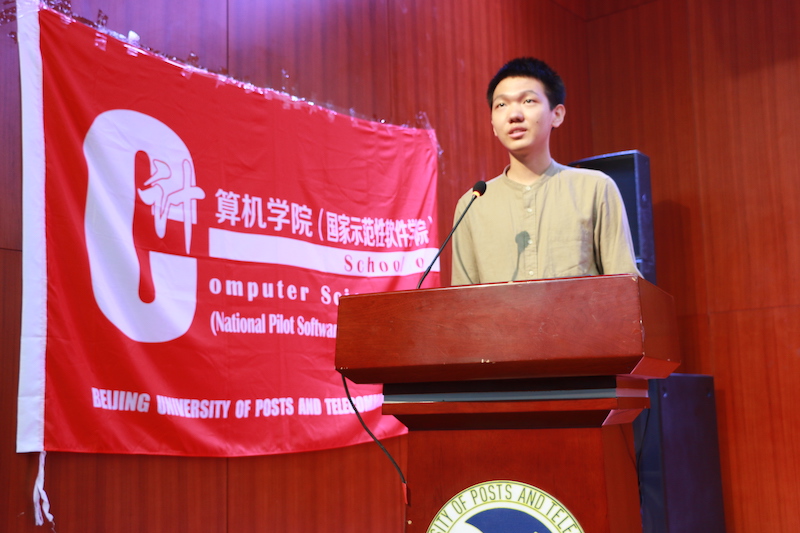 接下来,在校生代表2017级本科生尹思维同学发言,从参与扶贫项目、双创竞赛的丰富个人经历出发,回顾作为一个优秀的计算机学子的大学成长历程。用真实的经历,激励新同学树立信心,尽快适应大学学习方式并做好未来的发展规划,鼓励同学们牢记北邮校训,顺应时代潮流,担负时代使命。