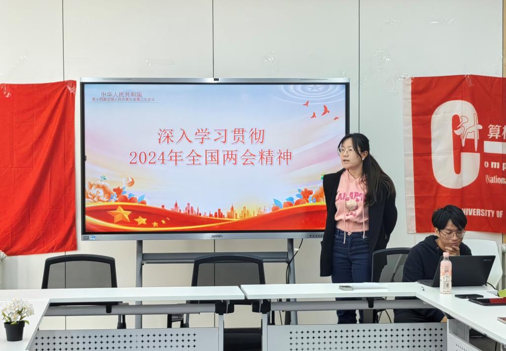 随后,2022级党支部理论学习组的三位同学分享了2024年两会概况及政府工作报告全文,从九个“新”视角带领大家读懂政府工作报告里的未来机遇。同学们深入学习2024年全国两会精神,深刻认识到在过去一年中,在以习近平同志为核心的党中央坚强领导下,在习近平新时代中国特色社会主义思想的科学指引下,党和国家发展取得的伟大成就。同学们结合过去一年中在日常生活中感受到的发展变化,畅谈感想,充分认识到作为青年党员,应当不断精进个人专业能力,为党和国家发展贡献力量。